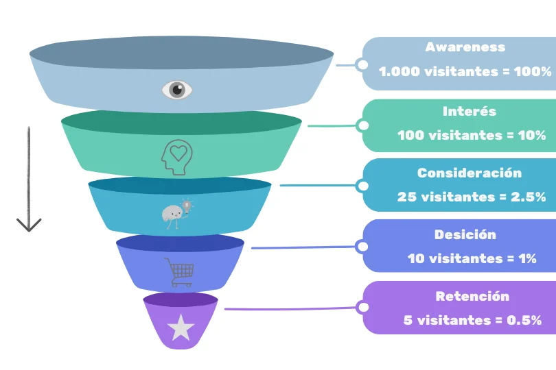 - Estándar exitoso: 5 etapas (Awareness, Interest, Consideration, Purchase, Retention)